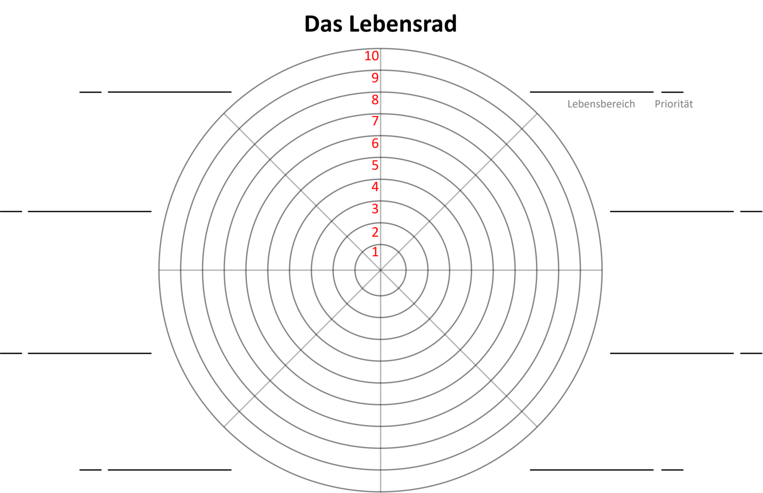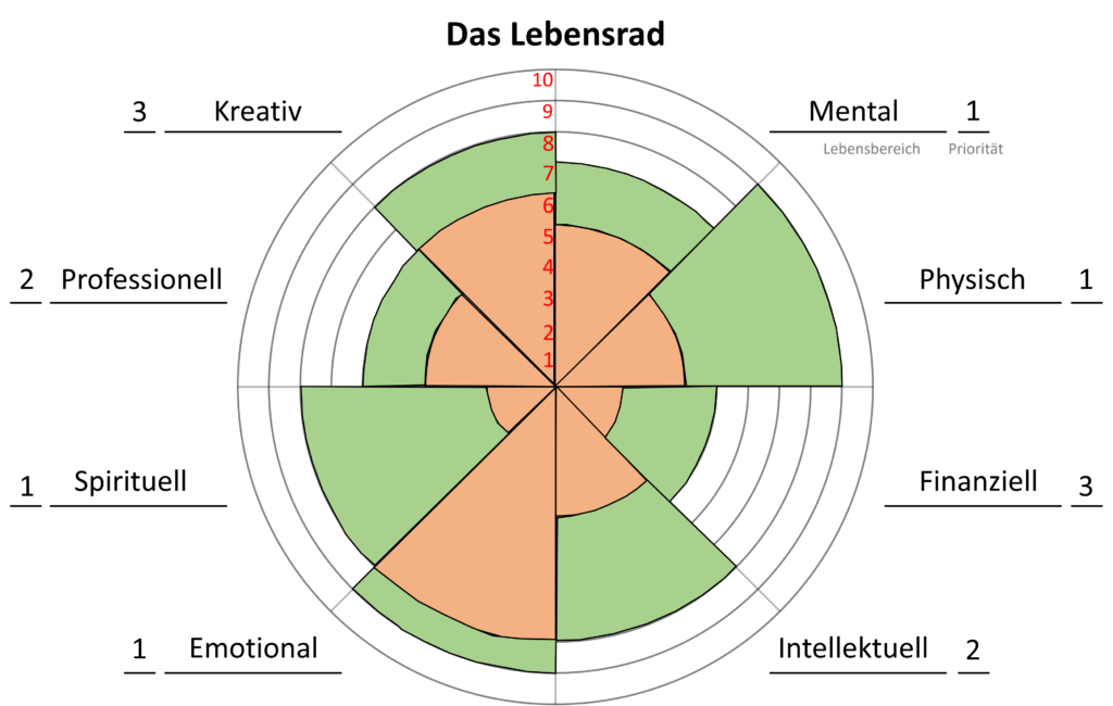 Für einen umfassenden Überblick über deine Lebenssituation kann dir das „Lebensrad“ behilflich sein. Dabei weist du verschiedenen Bereichen deines Lebens Werte von 0 (ganz schlecht) bis 10 (super gut) zu.